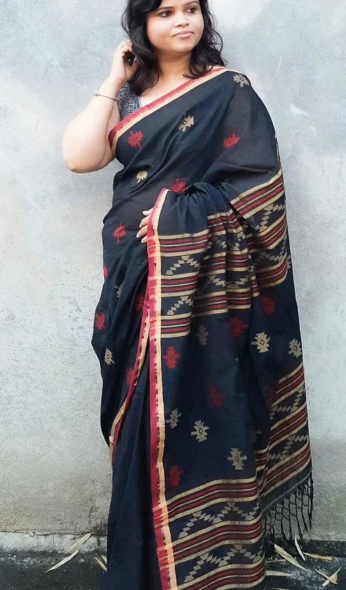 Embrace the charm of handloom weaving with this Black Handloom Cotton Jamdani Saree. Featuring a soft cotton base with woven red and golden buti motifs across the body, and a contrasting striped pallu, this saree is both affordable and graceful.