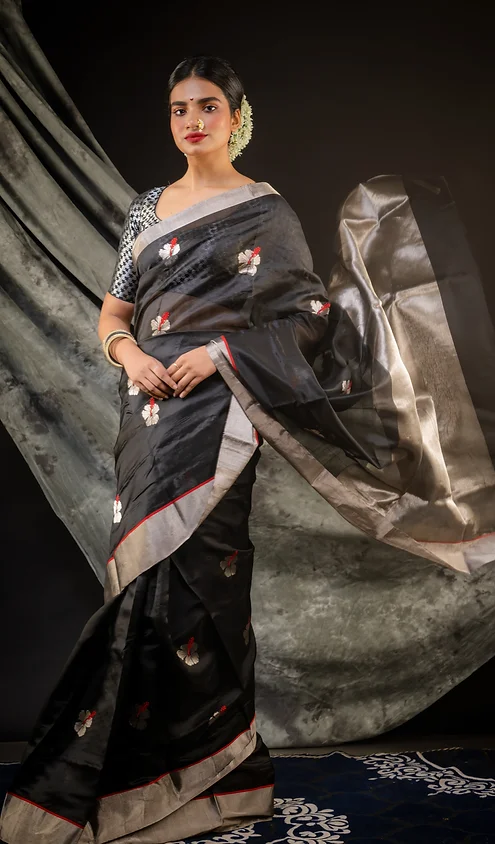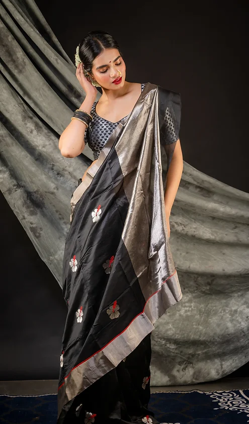 Color: Black with silver zari border & floral motifs