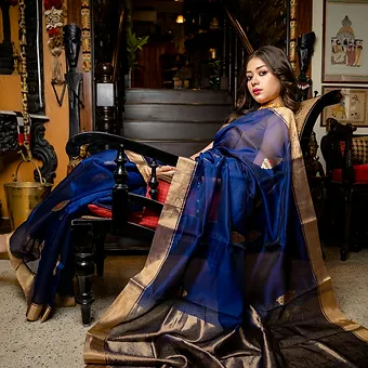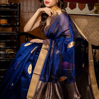 - Color: Royal blue with golden zari border and woven motifs