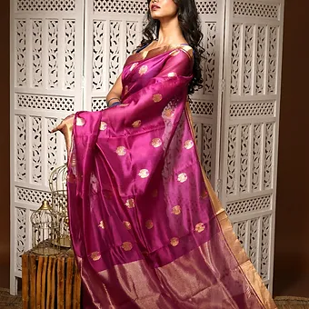 Step into timeless elegance with this Magenta Handloom Pure Silk Chanderi Saree, enriched with delicate golden zari buti motifs and a lustrous zari border. The bold magenta shade reflects vibrance and sophistication, while the handwoven silk adds natural sheen and effortless drape.