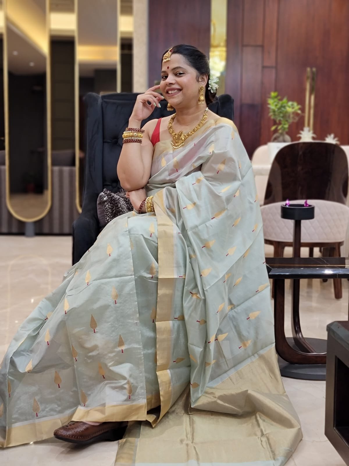 A rare pastel grey Chanderi silk saree with golden zari elegance