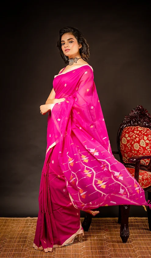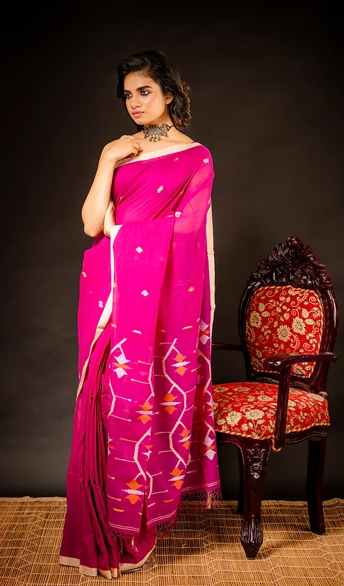 The Jamdani weave has been celebrated for centuries as Bengal’s weaving jewel. This saree combines that heritage with a vibrant pink shade, making it a cheerful yet practical choice for regular festive and casual wear.