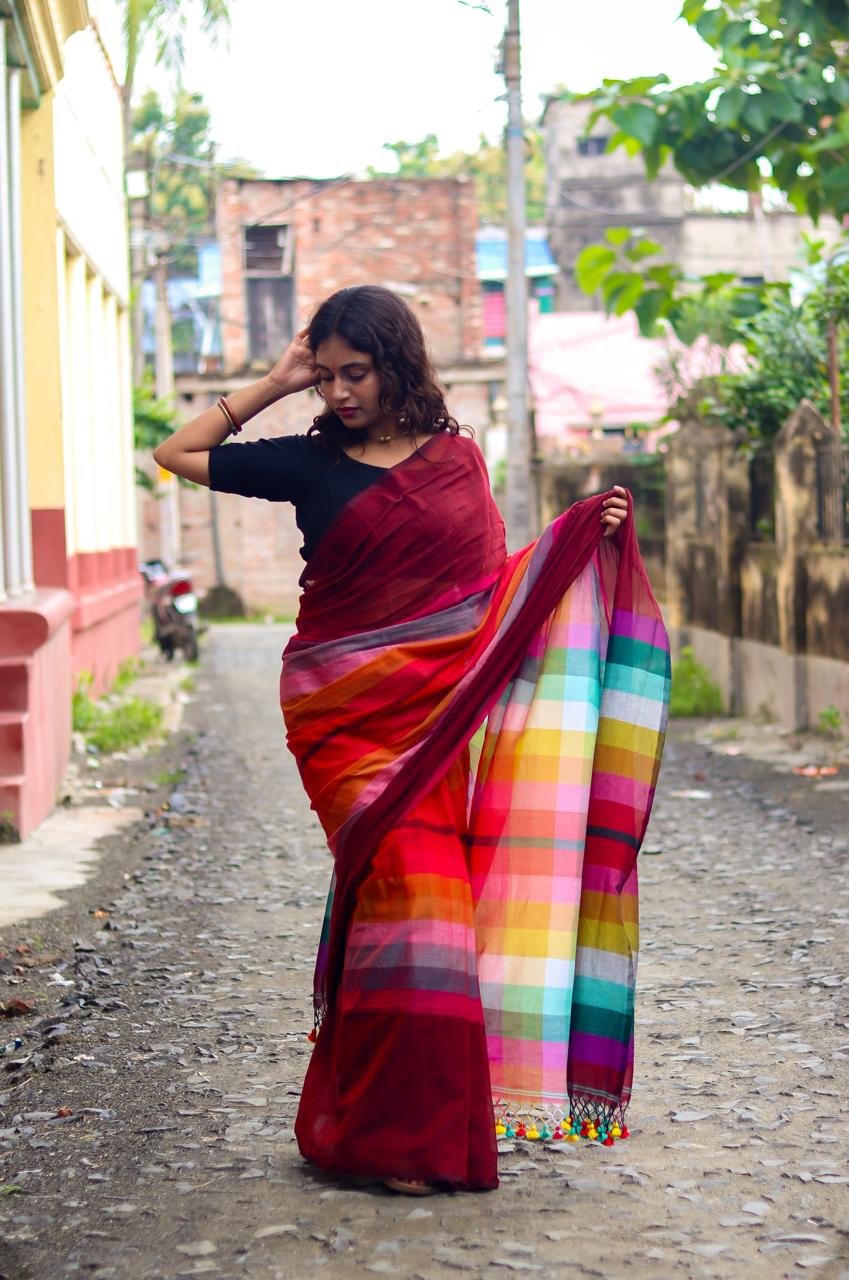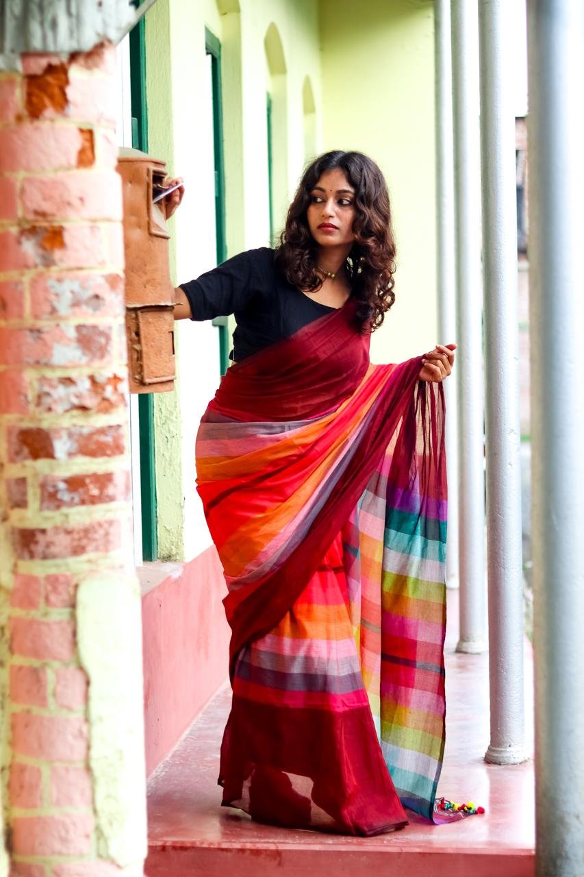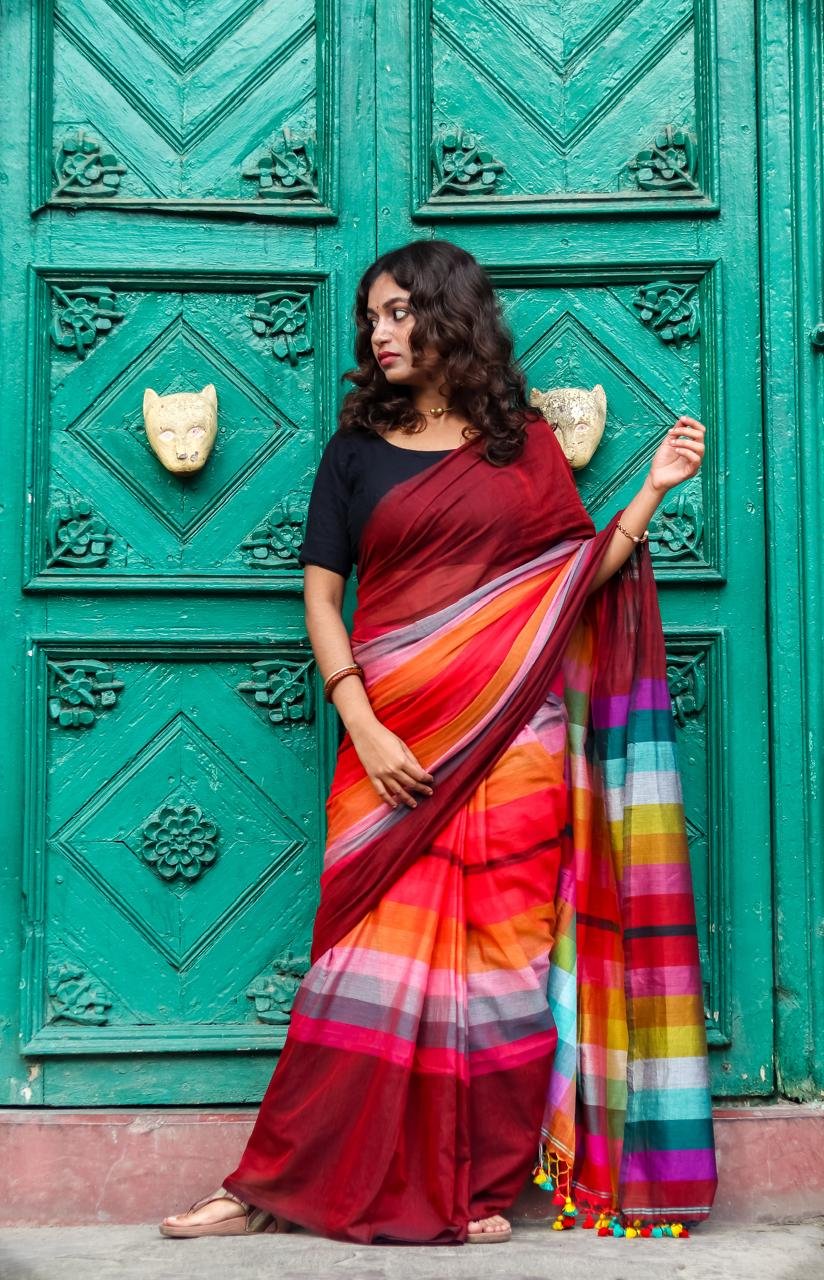 Rangeeli Handwoven Mul Cotton Saree with Multicoloured Stripes