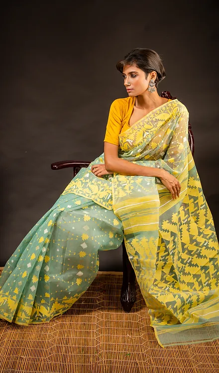 ✔️ Premium Dhakai Jamdani in rare yellow-green shade